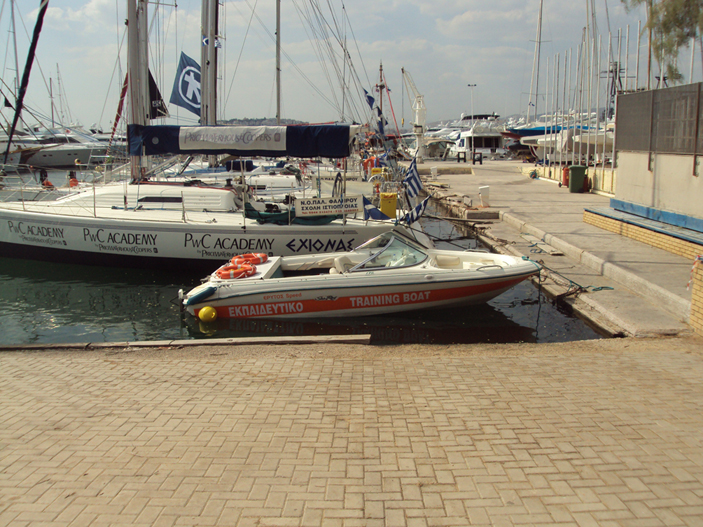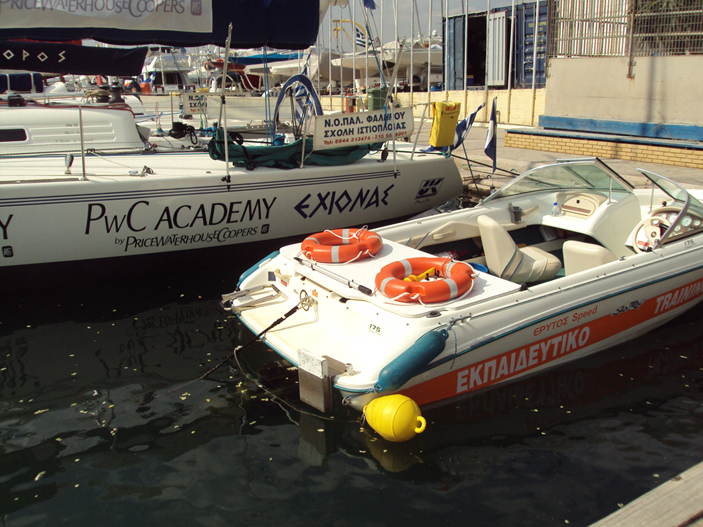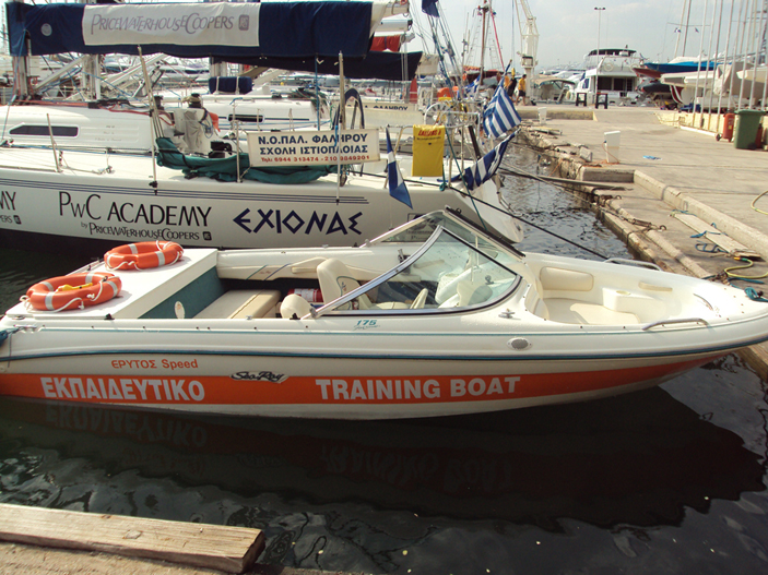 Το εκπαιδευτικό σκάφος μας είναι ένα αμερικάνικο sea ray 17.5. Τo ποιο κατάλληλο σκάφος για εκπαίδευση διοτι διαθέτει γάστρα και μηχανή εσω εξω 180hp που βοηθάει στην άμεση κατανόηση των ελιγμών (χειρισμών) ενός ταχύπλοου σκάφους, εξοπλισμένο με όλα τα απαραίτητα εφόδια για ασφάλεια και επιδείξη .